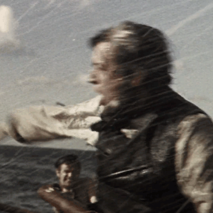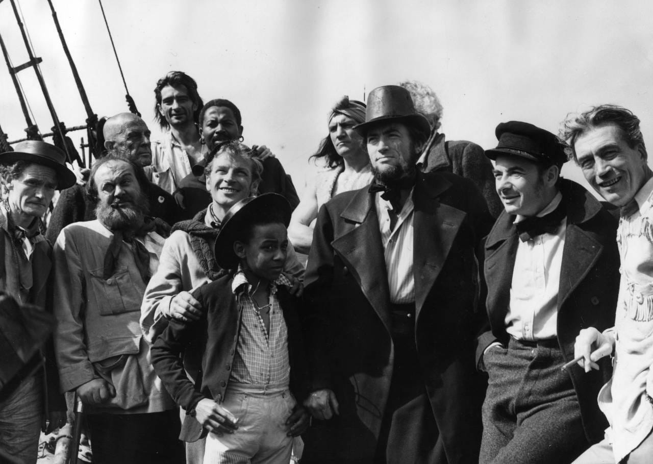 The military demeanour of almost the whole cast of Huston’s Moby Dick is all wrong: so many straight backs; so much respect for chain-of-command; so much obvious Naval discipline. Squint a bit and you can see the officer cohort of the Pequod gathered, soaked to the skin, on the bridge of a North Atlantic destroyer, scanning the horizon for u-boats.